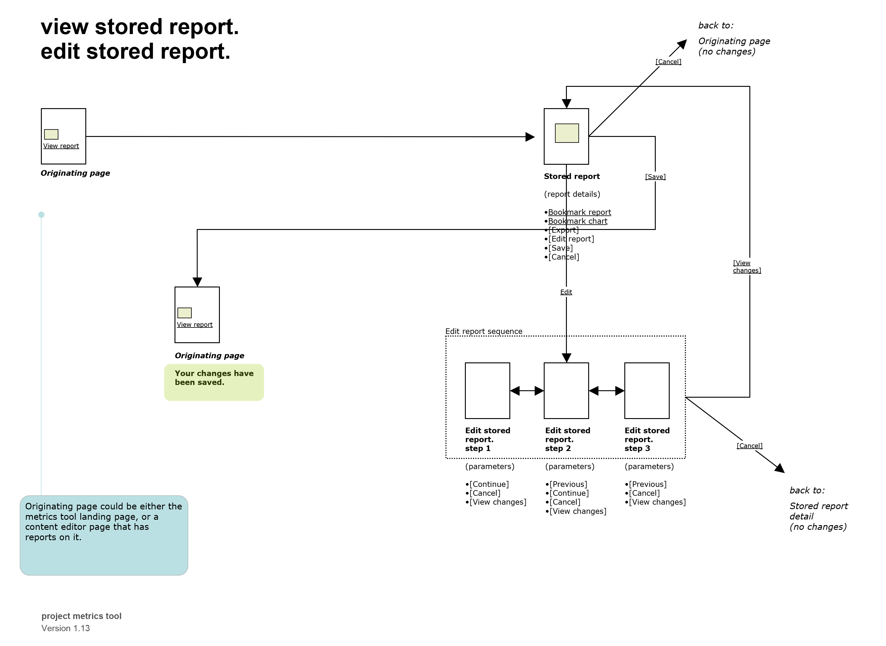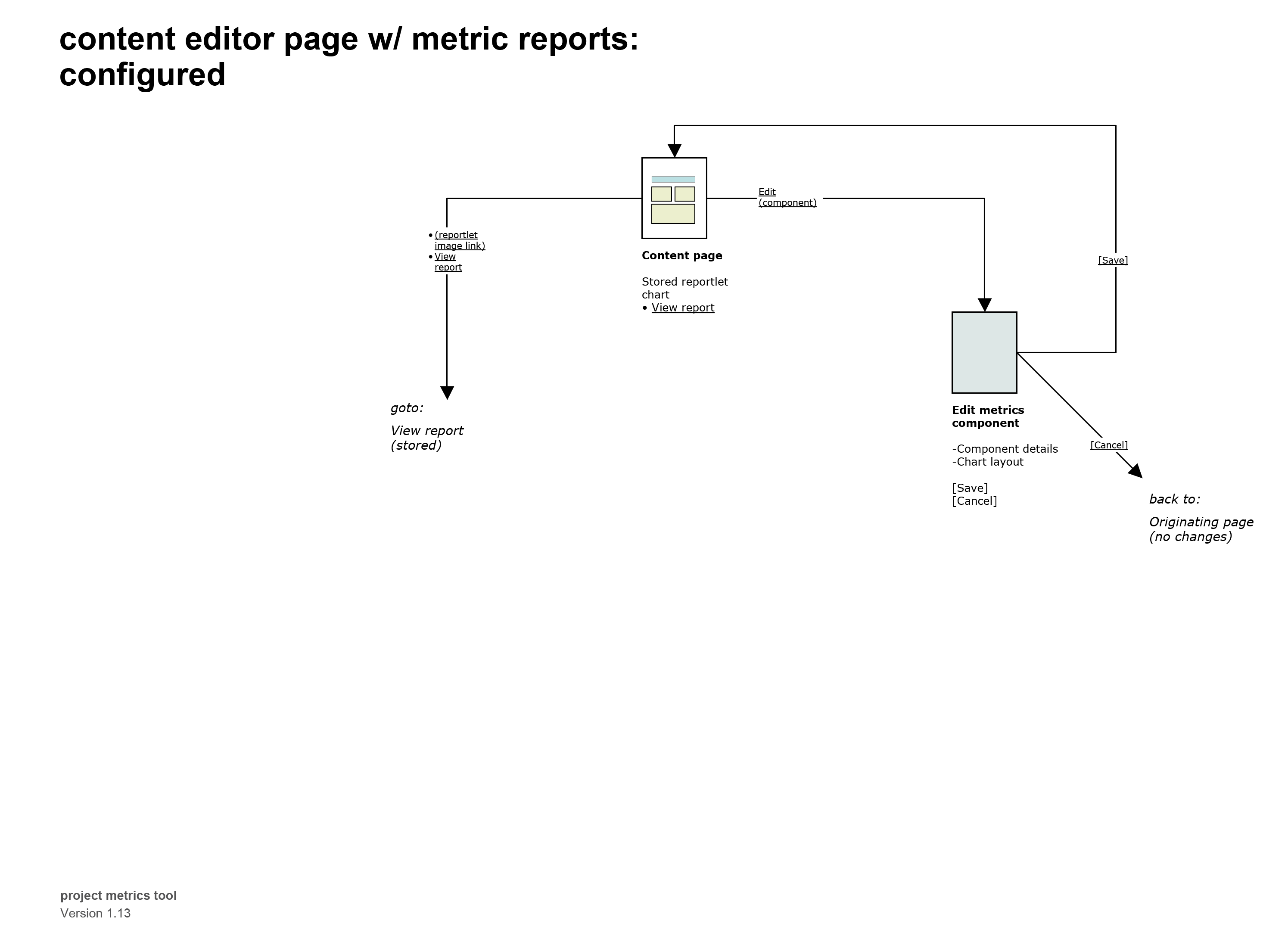 Project metrics seized on this by devising and designing a new report module, or page component, in the publishing system. The module could be added to any page, and it displayed on the page separate from any other free-form text/content. What the module really did was to define a “space” — a receptacle or container — where a report could exist. One container = one report. Eleven reports? Add eleven containers.